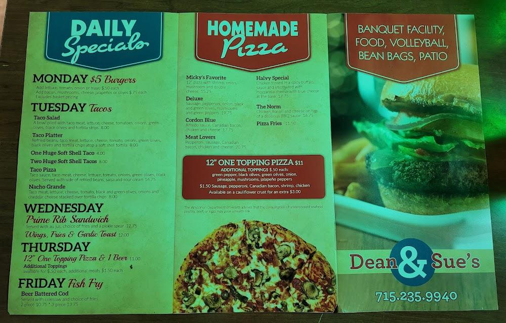 Welcome to Dean & Sue's Bar & Grill, your go-to destination in Menomonie for a casual yet vibrant dining experience. Located at 2002 Midway Rd, we offer a delightful menu featuring classic grilled specialties alongside a vast selection of beers and handcrafted cocktails. Enjoy our spacious patio, perfect for al fresco dining, or join us for lively events including karaoke and concerts. With fast service, happy hour deals, and a welcoming atmosphere, it's an ideal spot for lunch, dinner, or solo dining. Accessible for everyone, we invite you to savor delicious food and great company at Dean & Sue's!